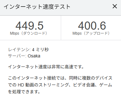 Googleのインターネット速度テストと、みんそくのPingの安定度測定の結果がこちら